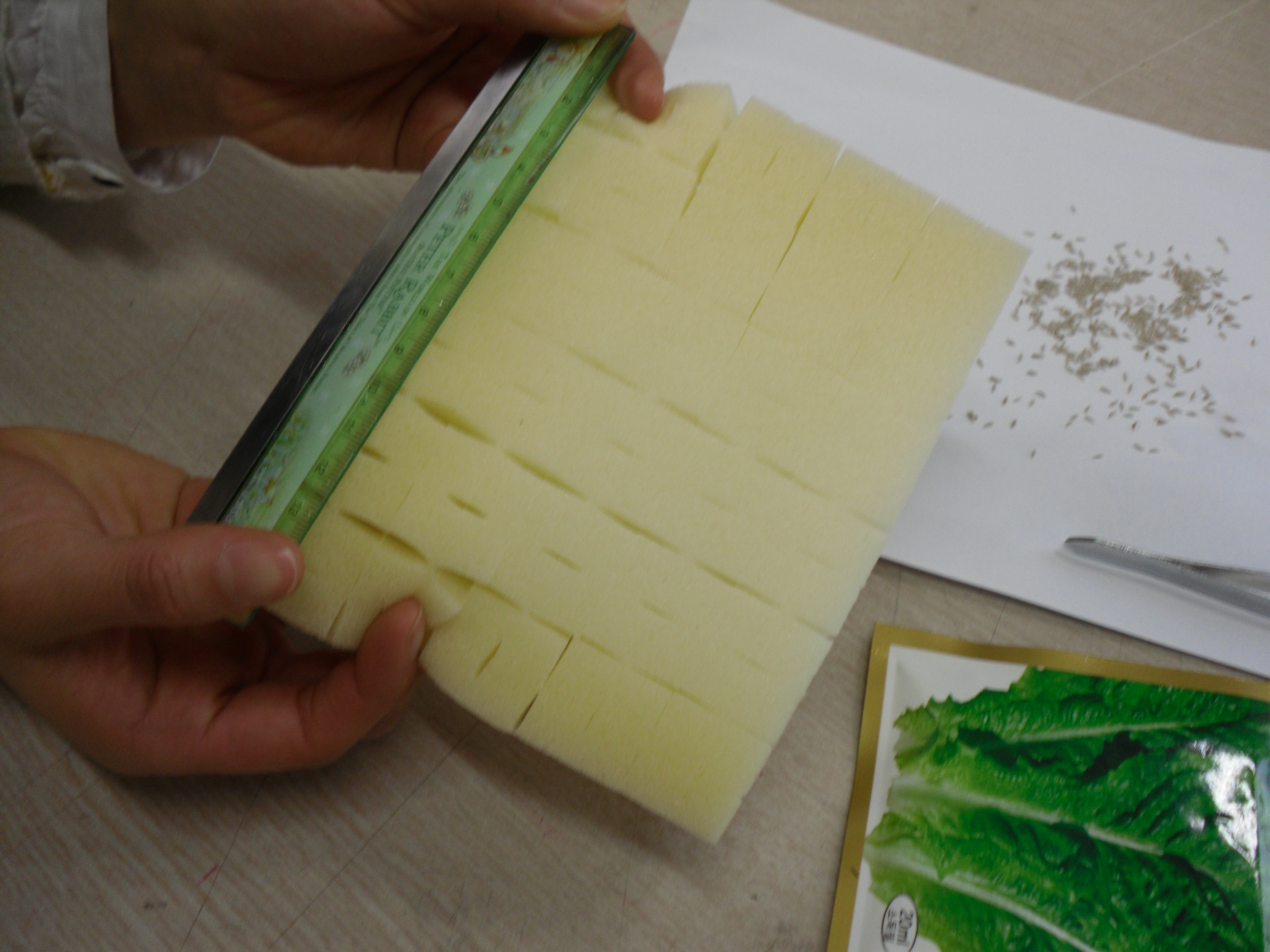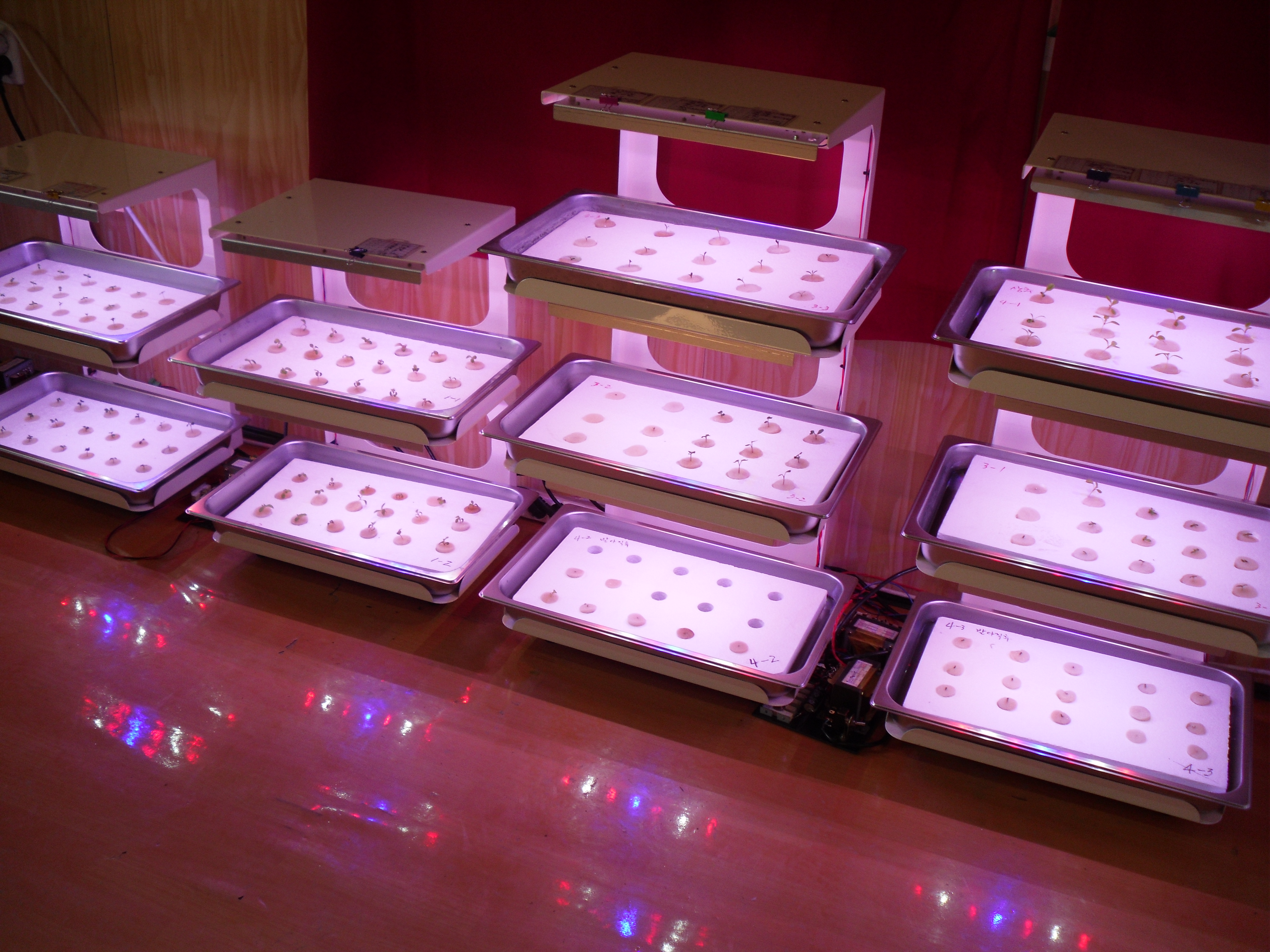 ¾Æ·¡(»çÁø 2) ¼³¸í: ½Ä¹°À» ¼ö°æÀç¹èÇϱâ À§ÇÑ Àç¹è»óÀÇ ¸ð½À. ¿À¸¥ÂÊ¿¡ 3´ÜÂ¥¸®(Àç¹è»óÀÌ 3Ãþ) ¸ðµ¨ SF-203 2´ë¿Í, ¿ÞÂÊ¿¡ 2´ÜÂ¥¸® SF-202 2´ë°¡ ³õ¿©ÀÖ´Â ¸ð½ÀÀÌ º¸ÀδÙ. °¢°¢ÀÇ Àç¹è»ó(Èò»öÀ¸·Î º¸ÀÌ´Â ½ºÆ¼·ÎÆû ÆÇ)¿¡´Â ÀÌÁ¦ °« Á¤½ÄÀ» ¸¶Ä£ ¾î¸° ¸ðÁ¾µéÀÌ ½É ¾îÁ® ÀÖ´Ù. À̹øÀÇ ½ÃÇèÀº ½ÇÁ¦ ÀϹÝÀÎÀÌ Á÷Á¢ Áý¿¡¼ º» Àç¹è»óÀ» ÀÌ¿ëÇÏ¿© ä¼Ò¸¦ Àç¹è, ¼öÈ®Çϱâ±î ÁöÀÇ °úÁ¤À» ¼³¸íÇÏ¸é¼ µ¿½Ã¿¡ ½ÇÁ¦ Àç¹è½ÃÇèÀ» ÇÏ´Â ÀÛ¾÷À¸·Î, ¾Æ·¡¿Í °°Àº ¼ø¼¿¡ ÀÇÇØ »çÁø°ú ÇÔ²² ¼³¸íÇØ ³ª°¡±â·Î ÇϰڴÙ. ¡Ø ¼ö°æÀç¹è º» ½ÃÇèÀÇ ±âº»Àº ´ç¿¬È÷ ¼ö°æÀç¹èÀÌ´Ù. ¼ö°æÀç¹è¶õ, ½Ä¹°ÀÌ ¹° À§¿¡ ¶°ÀÖÀ¸¸é¼ ÀÚ¶ó´Â °ÍÀ» ¸»ÇÑ´Ù. °¡Á¤¿¡¼, ±×°Íµµ 2´Ü, ¶Ç´Â 3´ÜÀ¸·Î ä¼Ò¸¦ ±â¸£±â À§Çؼ´Â ¼ö°æÀç¹è¹æ½ÄÀÌ °¡Àå ÆíÇÏ°í ½Ç¿ëÀûÀ̱⠶§¹®ÀÌ´Ù. ±×¸®°í ±× ¹æ¹ýµµ ¾î·Á¿î °ÍÀÌ ¾Æ´Ï´Ù. ºñ·Ï ¿ì¸®°¡ ¿øÇÏ´Â ½ÃÇèÀÇ ¸ñÀûÀº °¡Á¤¿ë ä¼ÒÀç¹è±â¿¡¼ LED ¸¸À» ±¤¿øÀ¸·Î ÇÏ¿© ½Ä¹°ÀÌ ½Ç¿ëÀûÀϸ¸Å ÀÚ¶ö ¼ö Àִ°¡¿¡ ÀÖÀ¸³ª, ±×·¯±â À§Çؼ´Â »ç½ÇÀû ½ÃÇèÀ» ÇØ¾ß ÇÒ °ÍÀ̱⠶§¹®ÀÌ´Ù. ±×¸¸Å º» ½ÃÇè¿¡´Â ¸ÕÀú ¼ö°æÀç¹è ȯ°æÀÌ ¸ÕÀú ¸¶·ÃµÇ¾î¾ß ÇϹǷΠ½ÃÇè°úÁ¤ÀÌ ±×¸¸Å ¹ø°Å·Î¿öÁö´Â °Íµµ »ç½ÇÀÌ´Ù. º» ½ÃÇèÀº ¿Â½Ç·Î °³Á¶ÇÑ °÷¿¡¼ ÁøÇàµÆ´Ù. ¼ö°æÀç¹è¸¦ À§ÇÑ ÀÛ¾÷ÀÇ ¼ø¼. 1. ½Ï Æ·¿ì±â: ä¼Ò ¾¾¸¦ ½ºÆÝÁö·Î µÈ ¸ðÆÇ¿¡ ½É¾î ¹°À» Àû¼Å µÎ¾î ½ÏÀ» Æ·¿ì±â. ¸ðÆÇÀ¸·Î »ç¿ëÇÒ ½ºÆÝÁö¿¡ »óÃß ¾¾¾ÑÀ» Çϳª Çϳª¾¿ Ä®ÁýÀÌ ³ª ÀÖ´Â ½ºÆÝÁö ÆÇ¿¡ ÇɼÂÀ¸·Î ²Å¾Æ ½É´Â´Ù. ¾Æ·¡ (»çÁø3)ÀÇ ¼³¸í. ¸ðÆÇÀÇ º¸±â: ¼ö°æÀç¹è¿¡¼ ¸ðÆÇÀ̶õ ½ºÆÝÁö ÆÇÀ» ¸»ÇÑ´Ù. ÀÌ ½ºÆÝÁö ÆÇ¿¡´Â »çÁø¿¡¼ º¸µí °¡·Î ¼¼·Î·Î Ä®ÁýÀÌ ³ª ÀÖ¾î °¡·Î ¼¼·Î °¢ 1.5cm Å©±âÀÇ Á¶°¢À¸·Î ¶â¾î³»±â ½±°Ô µÇ¾îÀÖ´Ù. ¶ÇÇÑ ÀÌ 4°¢ÀÇ °¢ Á¶°¢¿¡´Â ÇÑ °¡¿îµ¥ Ä®ÁýÀÌ ³ª Àִµ¥, ÀÌ·¸µí Ä®ÁýÀÌ ³ª Àִ Ȩ ¼Ó¿¡ ÇɼÂÀ¸·Î »óÃß ¾¾¾ÑÀ» Çϳª¾¿ ¿Å°Ü ²Å¾Æ ³Ö¾î µÎ¸é µÈ´Ù. ±×·± ÈÄ ÀÌ ¸ðÆÇÀ» ÇÃ¶ó½ºÆ½ ¿ë±â¿¡ ³Ö¾î ¹°ÀÌ ÃËÃËÇÏ°Ô Á¥µµ·Ï ÇØ¼ ¾îµÓ°í µû¶æÇÑ °÷(¾Æ·§¸ñ °°Àº °÷)¿¡ µÎ¸é 3ÀÏÂë ÈÄ¿£ ½ÏÀÌ Æ°´Ù. ¾¾¾ÑÀÇ Á¾·ù³ª »óÅ¿¡ µû¶ó¼± ÇÑ 10ÀÏ ÈÄ¿¡ ½ÏÀÌ Æ®´Â °æ¿ìµµ ÀÖ´Ù. .jpg)